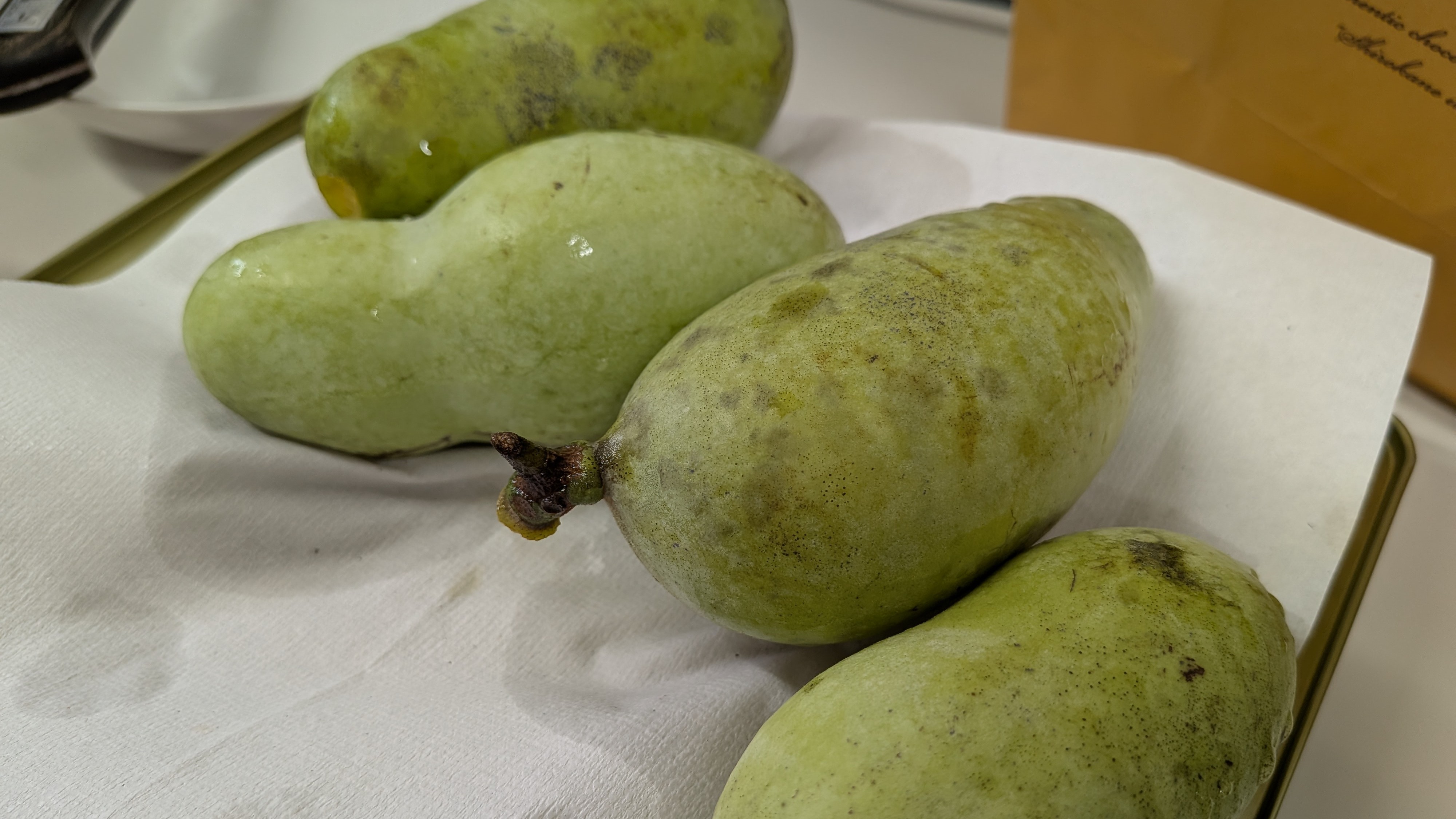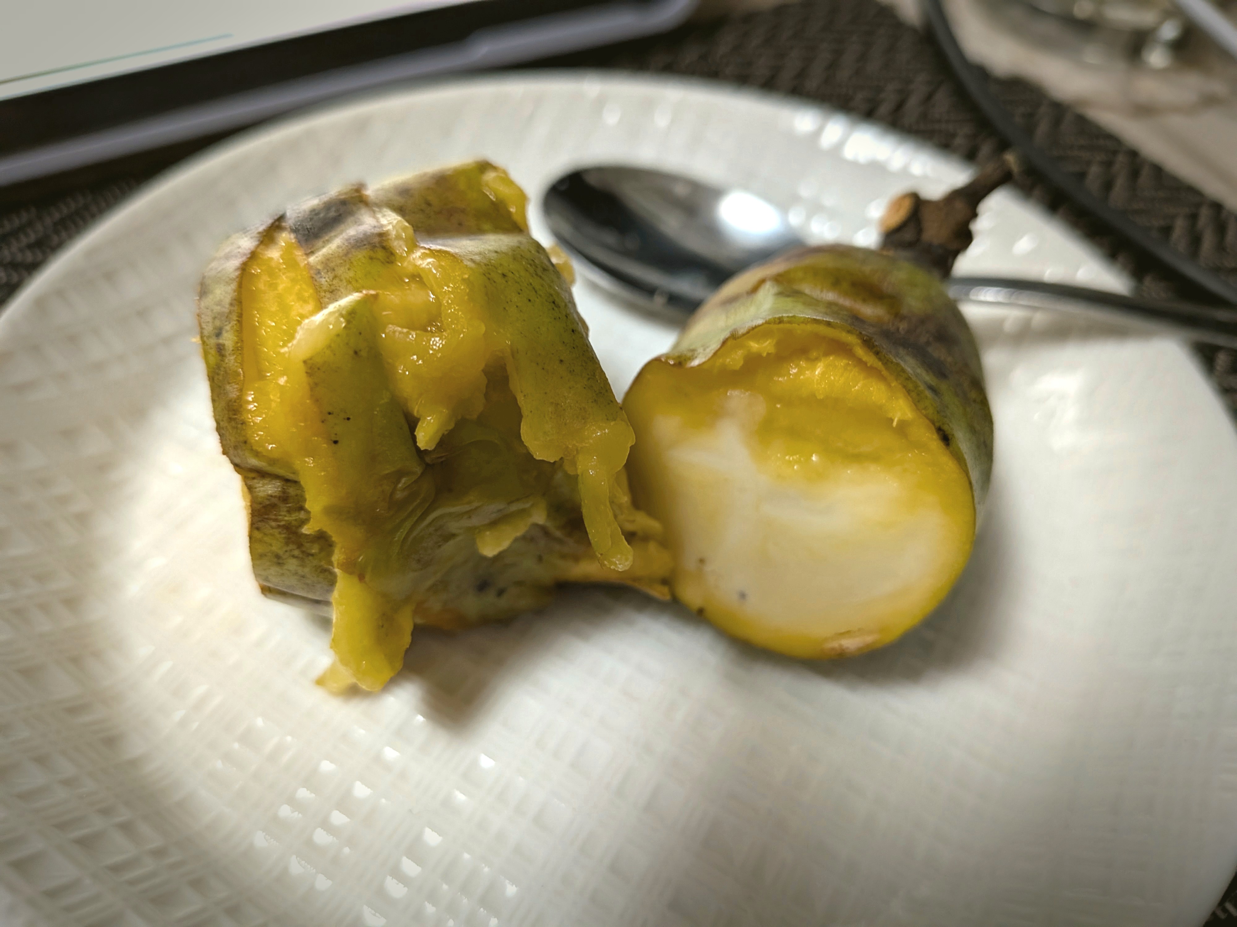 幻の果実ことポポー、追熟できたのでいただきました。食べる直前はトロピカルな香りで部屋がいっぱいになってたよ。