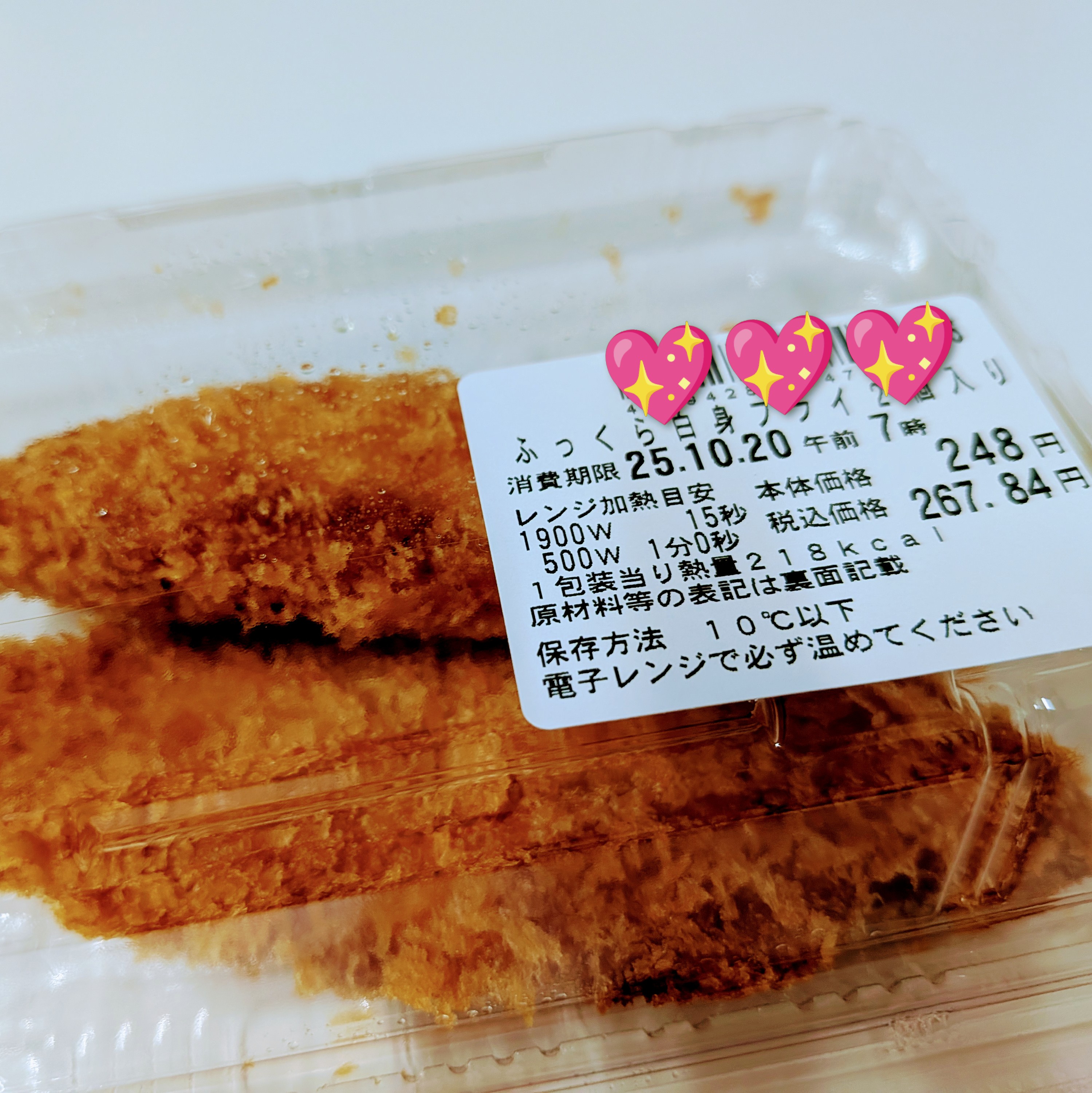 中でもこの白身魚のフライ!コンビニののり弁の上によく乗ってるこのフライ!私はこのフライが好きで好きでたまりません!!ちょっと塩気のある鱈が中に入っているのでソースなしでもおいしいです!至福!コンビニのホットスナックで肉はあっても魚はあまりなく、この白身魚フライが単品で売られることもそうそうないので、しばらくはこのフライを有り難くいただきます(ほどほどにしないと太るよ)。