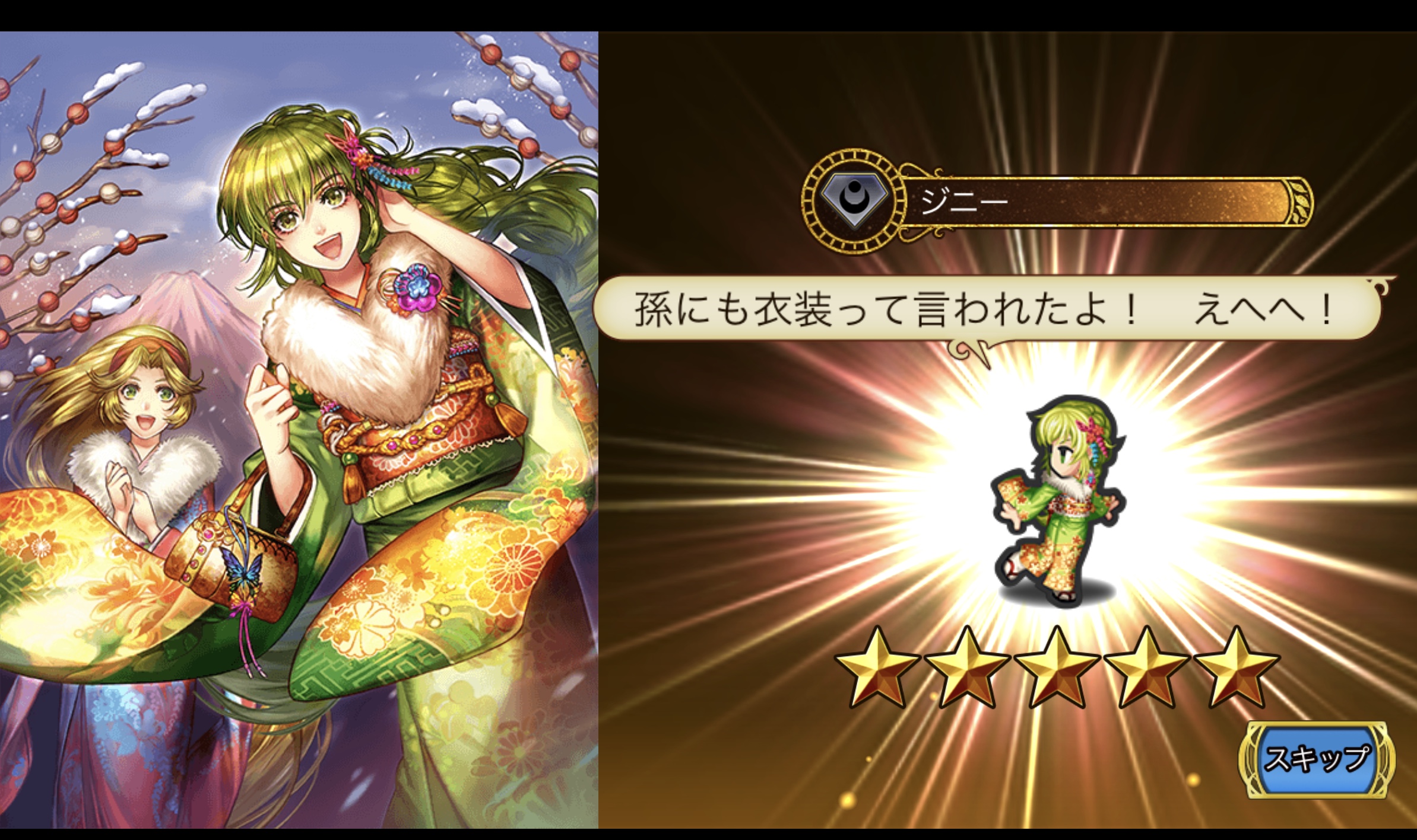 リユニの方の謹賀新年正月ガチャ、和装のロックブーケがかわいいし最終皇帝さんもカッコいいので、